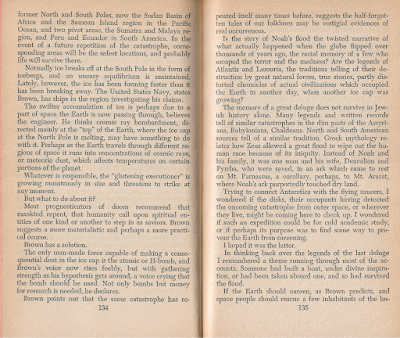 Here come the Men in Black! This is the book wherein Gray Barker introduces those sinister black suited creeps that have since become a UFOlogical standby. Barker certainly knows how to turn a phrase, and he weaves a twisted web of intrigue out of the flying saucer freakshow of the mid-50s. It's a worldwide whistlestop tour which includes the Flatwoods Monster, various contactees, the paranoid sexual miasma of the Shaver Mystery, and a detour into Hugh Auchincloss Brown and his theory of Catastrophic Pole Shift. The cure for which, by the by, is a flurry of H-Bombs a la Toho Studio's super science disaster epic Gorath. Brown's theory would later be the subject of a 1970s doorstopper disaster novel, The HAB Theory.