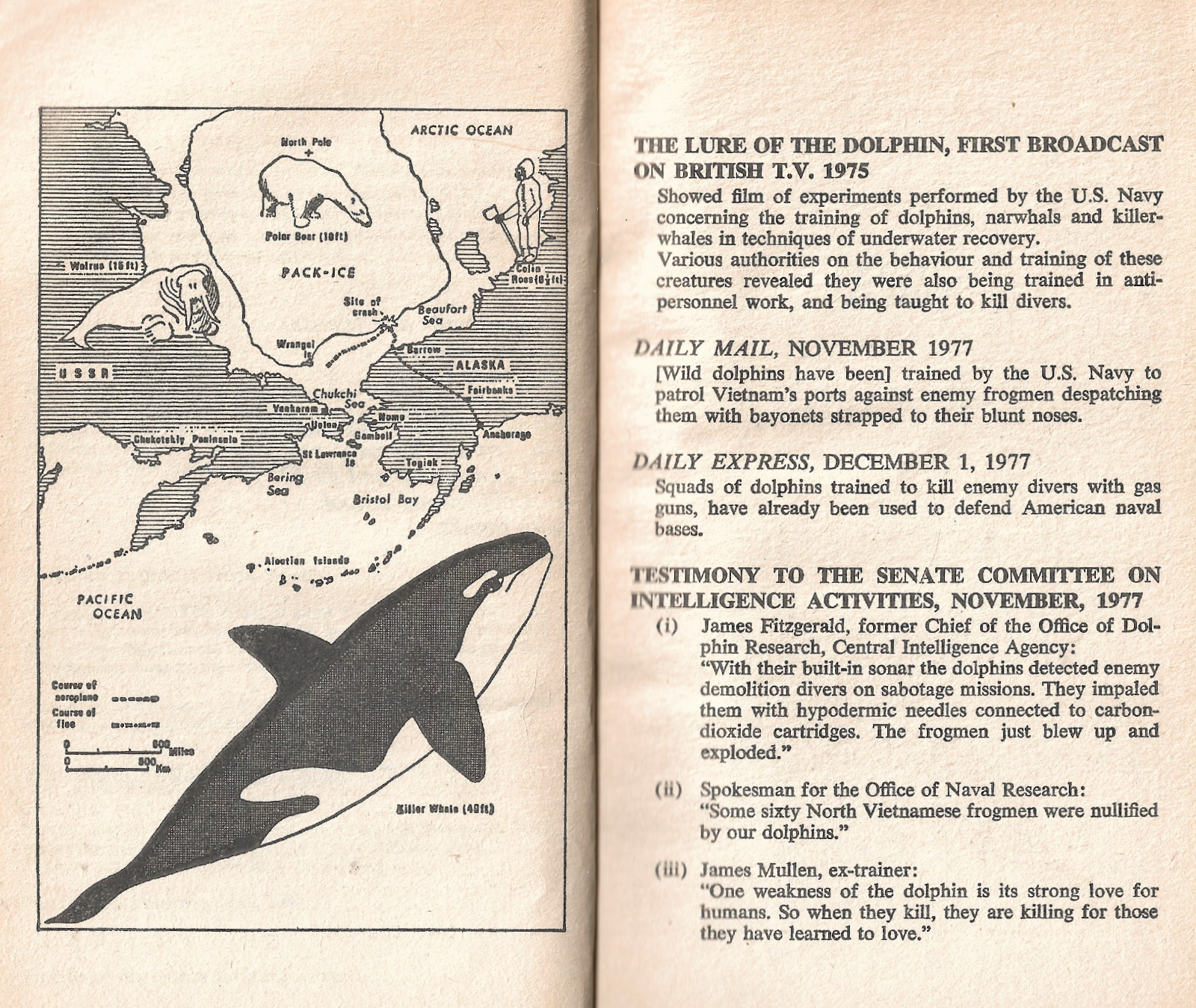 Our dramatic detour continues with a real KILLER story by Peter Tonkin plunging us into an icy ocean of Arctic terror! "As good as Jaws," says the Lewiston Journal, but I beg to differ because Tonkin's a far better writer than Peter Benchley, and his story is far more interesting than that famous bubblegum beach read. Benchley has since been very publicly remorseful of the shabby treatment he gave sharks in his breakout hit, and rightly so. Thankfully, Tonkin threads the needle for his subject much more successfully, and leaves no mistaken impressions of the mighty killer whale. First off, we have the simple fact that the orca, while a fearsome angel of death for seals, sea lions, and its larger cousins among Cetacea, has never been reliably documented hunting humans in the wild. Whereas Herzog and DeLaurentiis had to invent a mythical vengeance drive for their orca, Tonkin does them one better and puts the onus of his killer's bad attitude solely on humankind - specifically, a fictional extension to the very real and very disturbing "US Navy Marine Mammal Training Program" which trained dolphins in "anti-frogmen" techniques during Vietnam. Tonkin only has to stretch things a little bit to have the Navy attempting to train an awesome specimen of Orcinus orca in the same killer skillset, and he only needs a convenient jailbreak by this incredibly intelligent animal in order to kick off the action and put our cast of human characters in mortal peril. This small bit of dramatic license ends up giving us a much richer payoff than Benchley's unresearched, unnatural off-the-cuff writing: we already know how orcas react to the stresses of captivity, so imagine those dark impulses encouraged by a hubristic assassination program. We are the authors of our own misfortune.